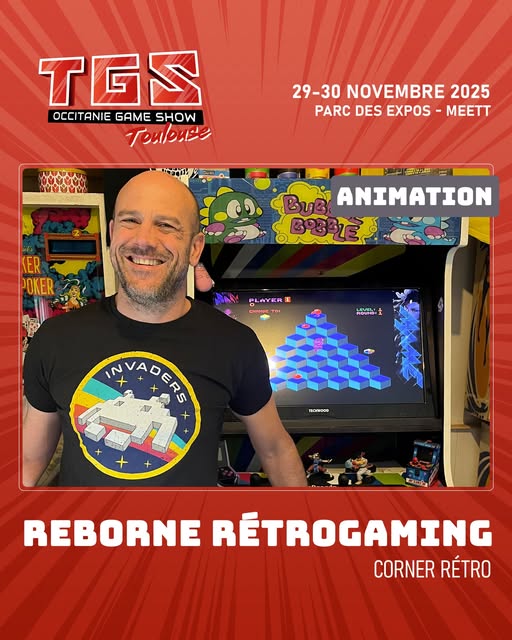 Reborne Retrogaming sera présent au Toulouse Game Show - au MEET à Aussonne. un stand de 36 m² consacré au rétrogaming avec animation sera mis en place avec des consoles de légende branchées sur écran cathodique, flippers Vitage, borne d'arcade et Table cocktail sera exposée pour jouer aux grands classique des jeux vidéos des années 80 / 90 / 2000.